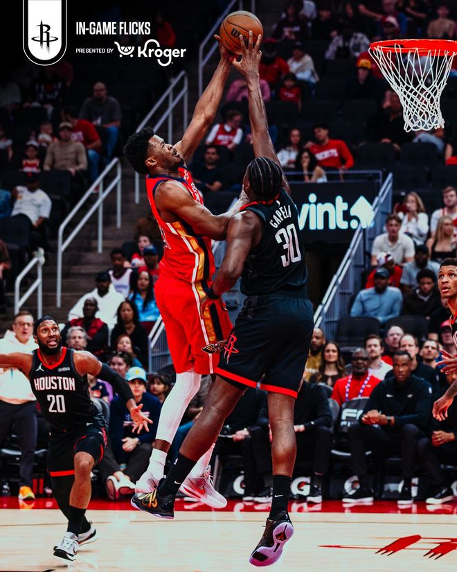 火箭队的申京缺席,芬尼-史密斯进入首发。开场的5平后汤普森连进两球,火箭队取得领先。锡安和墨菲联手6分帮助球队反超,杜兰特转身跳投回应,两队战成16平。21平、24平后卡佩拉和史密斯轮流扣篮,火箭队以28-24领先4分结束首节。